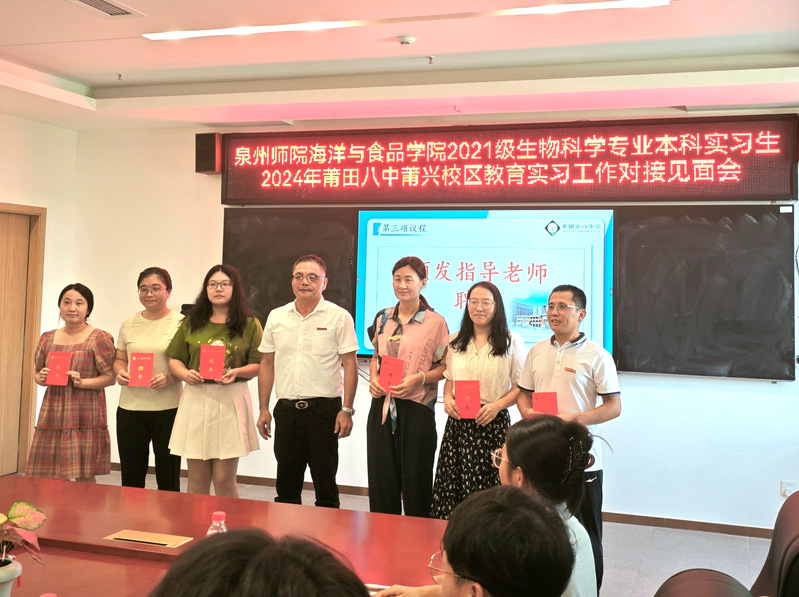 为更好实现教学理论知识与教学技能的结合,提升师范生教育实践、综合素质能力,强化师范生教书育人初心,2024年9月8日,泉州师院海洋与食品学院2021级生物科学专业的20位实习生前往莆田第八中学召开为期16周的秋季集中教育实习,其中10位实习生在莆田八中高中部(莆兴校区)实习,另10位实习生在八中初中部(鳌峰校区)实习,并于9月19日举行了教育实习见面会。