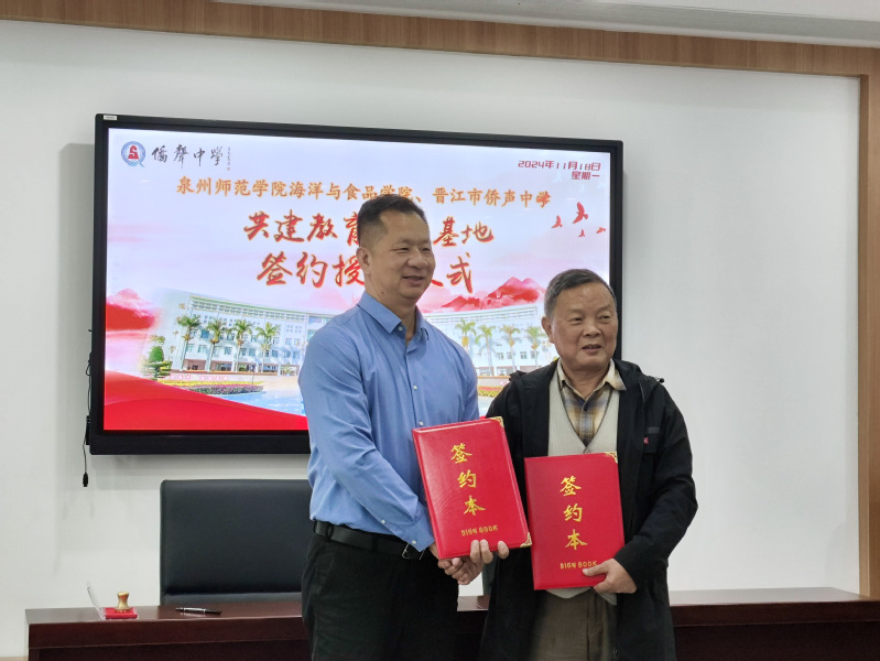 11月18日,海洋与食品学院与晋江市侨声中学共建教育实践基地签约授牌仪式在晋江市侨声中学举行。仪式由侨声中学教务处主任周明阳主持。参加仪式的有海洋与食品学院院长袁建军、党委书记蔡志荣、党政办公室主任洪钦赐,生物科学系主任陈细香、副主任王艺璇,侨声中学党委书记兼校长吴健康、教务处主任周明阳、副主任张劲松、蔡阿园、俞建明、主任助理陈秀盆以及生物组教师。