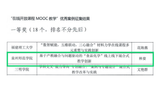 近期,福建省高校在线教育联盟公布推荐“全国慕课教育创新大会(第五届)暨高校在线开放课程联盟联席会2024年会”会议研讨成果征集结果,我院林娈副教授负责的案例——基于产教融合与问题驱动的“食品化学”线上线下混合式教学创新,获“在线开放课程/MOOC教学”优秀案例一等奖。我院今后将挖掘更多特色应用,进一步鼓舞和动员更多教师召开数字化、智慧化教育教学改革,加强一流课程建设,提高人才培养质量。