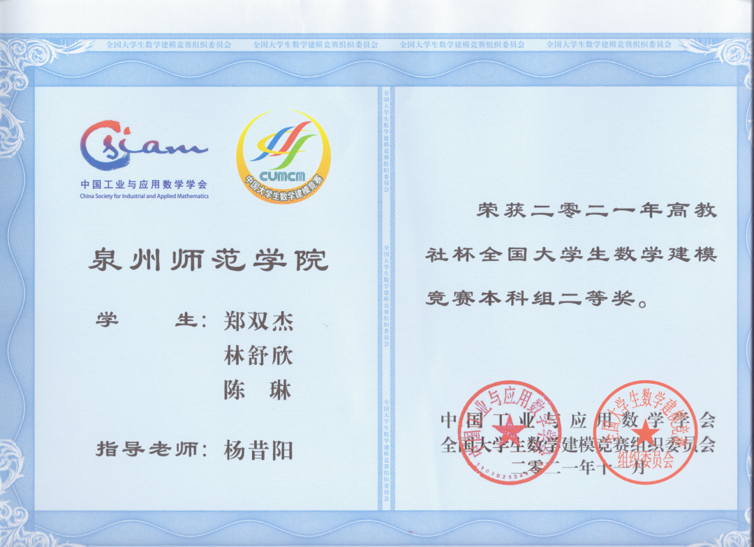 202111月荣获全国大学生数学建模竞赛国家级二等奖二项,省级一等奖三项,省级二等奖八项。