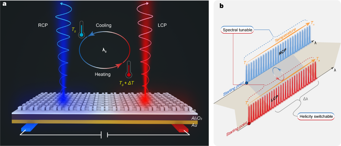热辐射是自然界中普遍存在的现象,但传统的黑体辐射通常是宽带、非相干且无偏振的,这使其在红外传感和高分辨率成像等先进光子学领域的应用受到限制。随着纳米光子学,特别是超构表面和光子晶体的开展,科学家们逐渐能够在亚波长尺度上精准操控热辐射的相位、振幅和偏振,从而拓宽了其应用范围。其中,实现圆偏振热发射对于圆二色性光谱分析、偏振编码通信等领域至关重要。然而,现有的圆偏振热发射器大多是静态设计,缺乏光谱调谐和偏振态重构的能力。此外,主动调节波长以匹配吸收特征或补偿制备偏差,以及对热发射旋性进行动态调控,都是提升系统性能和实现精确传感的关键。