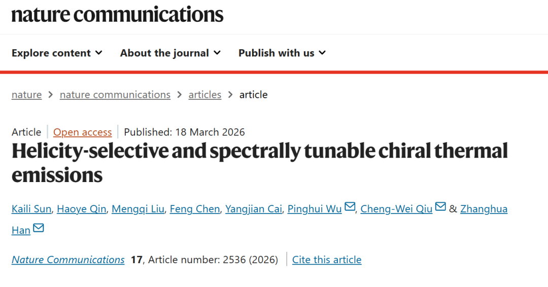 近期,国际顶级期刊Nature子刊《Nature Communications》(IF:15.7,中科院一区,TOP期刊)在线发表k8凯发(中国)物理与信息工程学院吴平辉教授团队与合作者的研究论文“Helicity-selective and Spectrally Tunable Chiral Thermal Emissions”。吴平辉教授、新加坡国立大学仇成伟教授和山东师范大学韩张华教授为论文共同通讯作者;山东师范大学博士生孙开礼为论文第一作者。