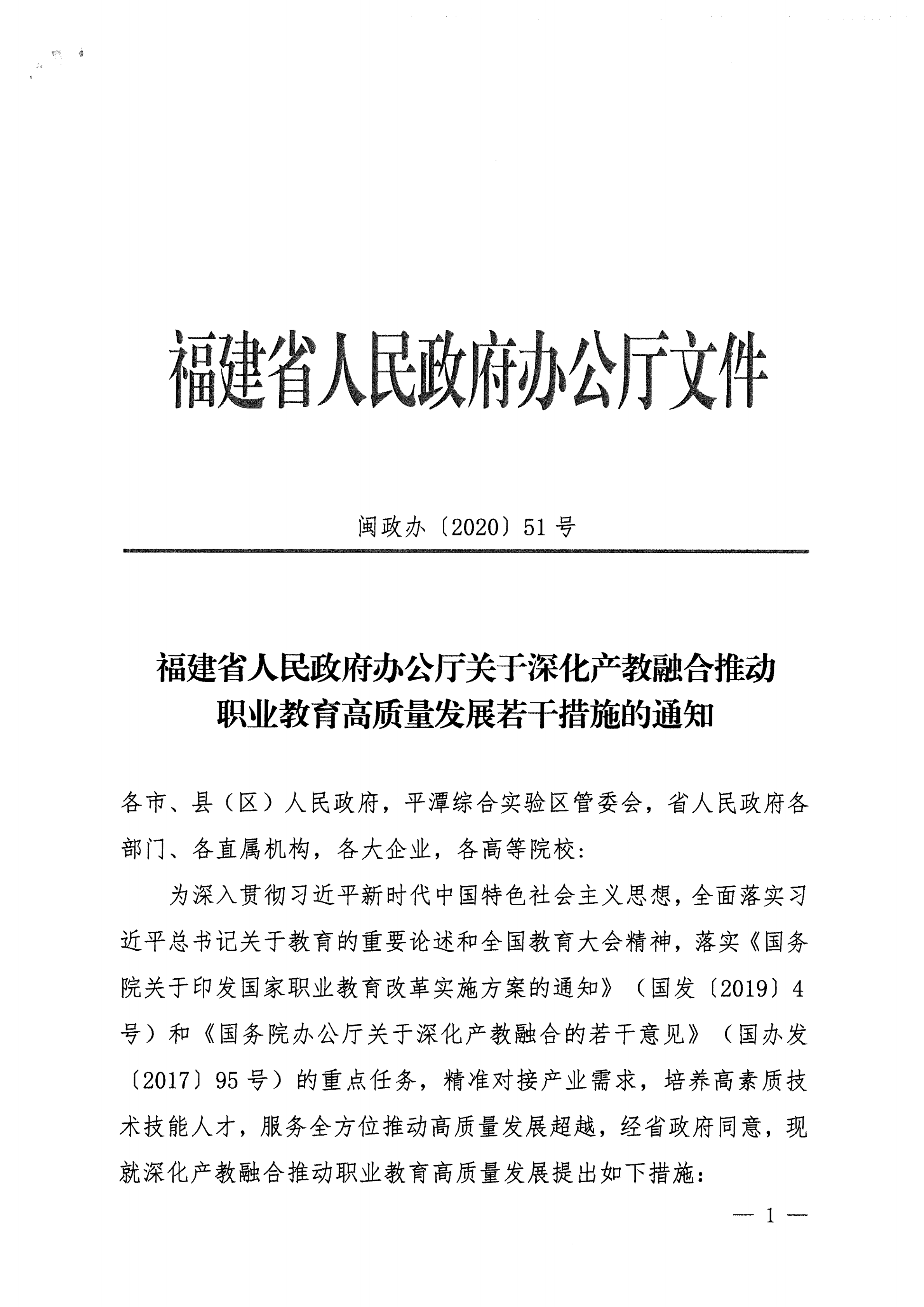 转发《福建省人民政府办公厅关于深化产教融合有助于职业教育高质量开展若干措施的通知》