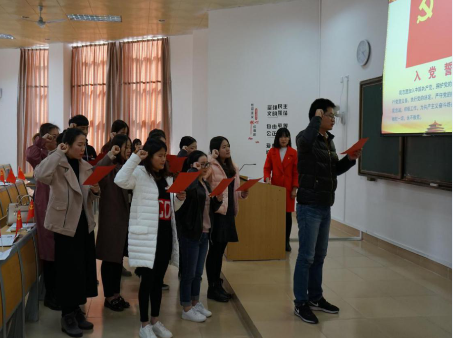 大会的最后,由学生团支部副书记孙浪涛领誓,11名预备党员面向鲜红夺目的中国共产党党旗,整齐列队,紧握右拳,高声宣读入党誓词,向党组织作出郑重承诺。