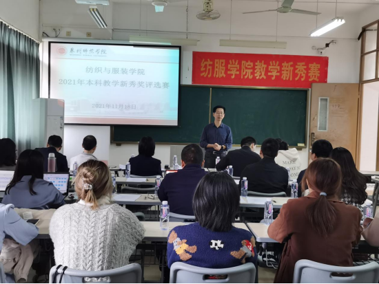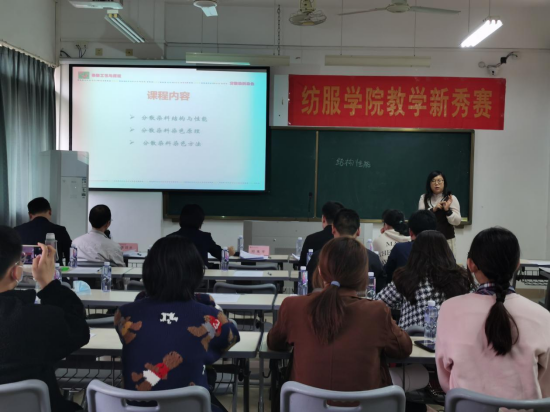 11月18日下午,纺织与服装学院本科教学新秀奖评选赛在理工417如期举行。赛前,由邱夷平院长致辞,鼓励参赛教师流畅把握课堂节奏,加强师生有效互动,持续融入先进教学手段,取得良好的教学成果。竞赛期间,所有参赛教师在课堂教学节段里充分展示了教风教态、教学组织能力以及教学特色。经教学竞赛听课专家组评审、教师互评及教学信息员评分,最终由学院教学竞赛评选工作小组评定,综合评出一等奖2名、二等奖3名、三等奖4名。赛后,由徐海燕副院长总结讲话,鼓励参赛教师挖掘课程思政元素,强化教学顶层设计,梳理讲授内容重难点,不断提升课堂教学质量。