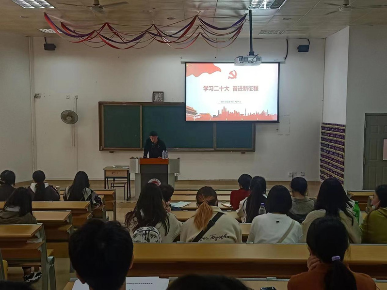 团委书记、学工办主任聂莹从如何为全面推进中华民族伟大复兴贡献青春力量的角度,对党的二十大提出的新思想、新论断、新部署、新要求进行解读,并勉励同学们要坚定不移跟党走,勇担时代重任,努力学习、砥砺奋进。