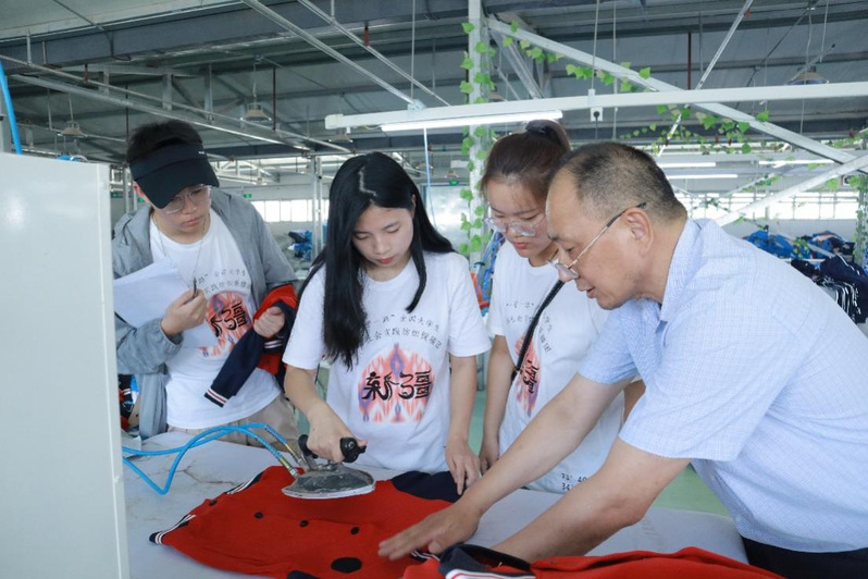 星博服饰厂长教授援疆团轮台小分队员徐漫妮等同学(左2)熨烫技巧