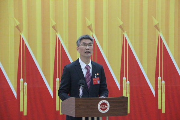 黄国波汇报大会筹备工作情况,并代表学院本届党委向大会作《踔厉奋发 勇毅前行 共同谱写纺织与服装学院高质量开展新篇章》的工作报告。