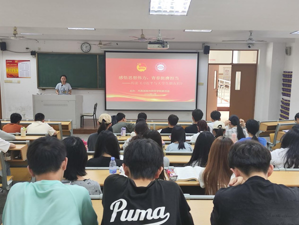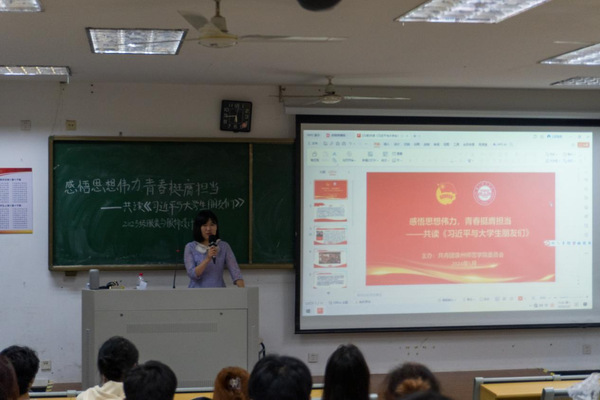 辅导员廖春霖带领同学们共读了《习近平与大学生朋友们》的部分内容,并对同学们提出了三点希望,一是希望同学们坚定理想信念,矢志艰苦奋斗,不负青春韶华;二是希望同学们在学期间多参加社会实践、志愿服务项目、专业实习等,在实践中学知识、长才干、强素质;三是希望同学们厚植家国情怀,到基层和人民中去建功立业,让青春之花绽放在祖国最需要的地方。