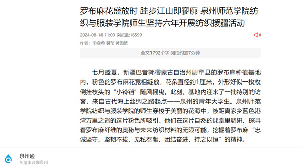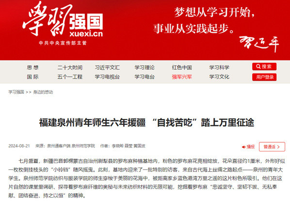 据悉,纺织与服装学院师生自2017年起已坚持六年参加由国际先进材料与制造工程学会(SAMPE)全球常务理事长邱夷平担任总指挥的“一带一路”全国大学生纺织援疆活动。六年来,学院累计派出师生近百人,不畏炎炎夏日,“自找苦吃”踏上万里援疆征途,以纺织为媒,将知识与实践深度融合于产业调研、企业授课与文化研讨之中,足迹已深深烙印在新疆伊宁、库车、阿拉尔、昌吉等多地。此次社会实践活动获学习强国、泉州通平台报道。