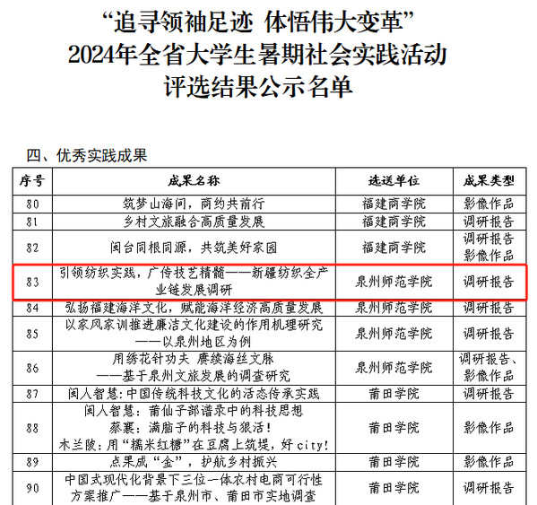 10月8日,中共福建省委教育工作委员会公布了“追寻领袖足迹 体悟伟大变革”2024年全省大学生暑期社会实践活动评选结果,纺织与服装学院“引领纺织实践,广传技艺精髓——新疆纺织全产业链开展调研”项目获评优秀实践成果。