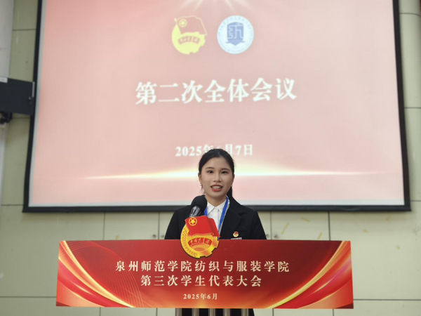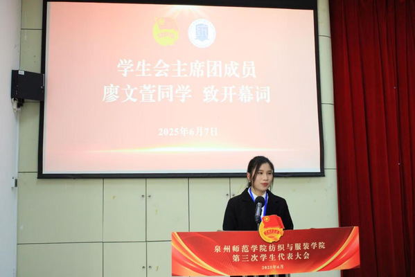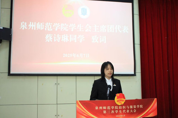 校学生会主席团代表蔡诗琳对大会的召开表示祝贺。她表示,过去一年来纺织与服装学院学生会在思想引领、学风建设、权益服务、社团活动等方面的工作取得显著成效她希望大家要坚定理想信念,锐意开拓进取,勇于自我革命,争做有理想、敢担当、能吃苦、肯奋斗的新时代好青年,彰显青春风采,贡献青春力量。