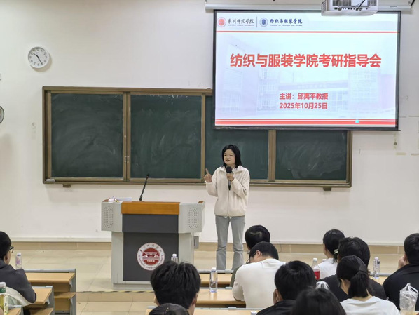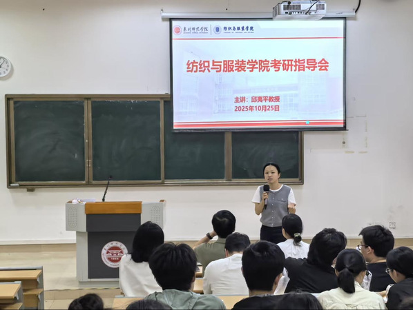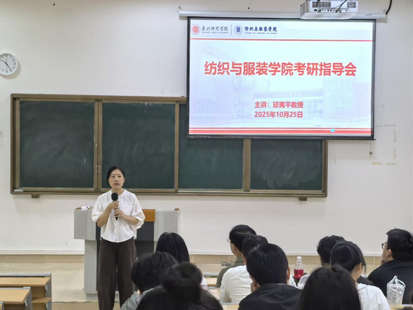 10月25日上午,纺织与服装学院在荣助楼212教室举办考研指导讲座。会议邀请了纺织与服装学院原院长邱夷平主讲,学院党委书记黄国波、学工办主任聂莹、青年教师黄媛、辅导员李晓希、研究生代表及考研同学参加。黄国波主持讲座。