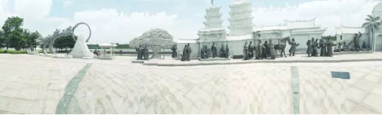 长达120米的东亚组雕,最精彩的是,跟平常单面雕塑不同,这组雕塑还借鉴了“双面绣”的灵感。其中,正面分别表现了听涛、飞天、诗文、双塔下奏唱南音、丝绸交易和瓷器交易、清净寺外香料珠宝石交易和文化研讨、商人进城、使团到港、商舶装卸货、货物盘点和启航等场景和意象。背面则是航行、海市、亲人重逢、喜迎客商、提线木偶表演、观赏花灯、抚琴等场景和意象。