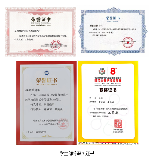 近三年,学生参加学科竞赛获省级以上奖50多项,其中国家级一等奖3项、二等奖9项、三等奖10项;获省级以上大学生创新创业训练计划项目17项,其中国家级5项;学生发表学术论文40余篇。部分学生成功考取四川大学、福州大学、苏州大学、首都师范大学、福建师范大学等高校研究生,2024届毕业生考上研究生16人,占毕业生总数16.7%。