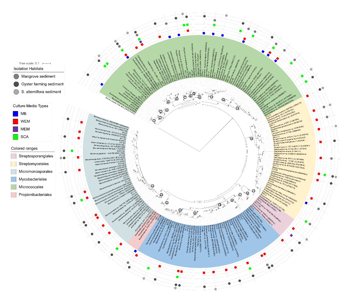 放线菌(Actinobacteria)是一类好氧,高G+C含量的革兰氏染色阳性细菌。因放线菌能产生丰富多样的次级活性代谢产物而备受关注,如抗生素、酶制剂等。近岸沉积物中蕴含着丰富的海洋微生物资源,是人类开发利用的宝贵财富。然而绝大多数的微生物仍然未培养(uncultivated)。那么如何获取微生物资源是人们不断关注的重点问题。
