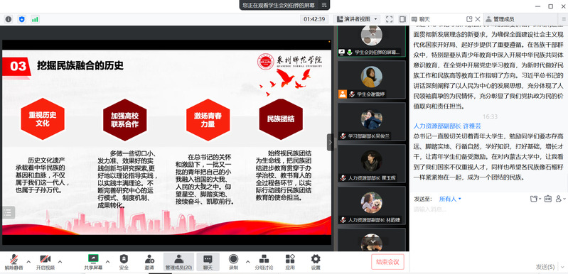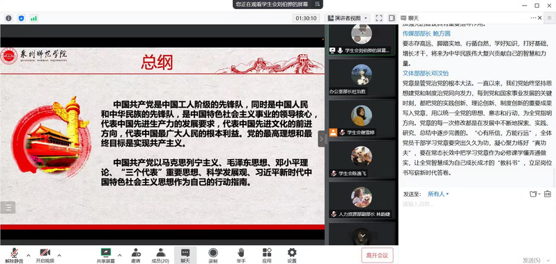 此次培训采用线上形式,学院学生会主席团成员作为主讲人,带领学生会成员们进行了“学习《关于有助于高校学生会(研究生会)深化改革的若干意见》”“学习《关于落实共青团和学联对高校学生会(研究生会)指导管理责任的若干规定(试行)》”“学习《福建省学生联合会章程》”“学习《关于进一步加强高校学生会组织章程建设工作的通知》”“学习纪念“一二•九”运动”“学习党的二十大精神”“学习新党章”“学习习近平总书记考察内蒙古大学重要讲话精神”等8个主题的学习。培训会上,同学们踊跃发言,畅谈感悟,学习氛围十分浓厚。大家纷纷表示,将自觉加强理论学习,提高政治思想素养,坚定理想信念,持续向党组织靠拢,充分发挥学生干部的模范带头作用,踔厉奋发,笃行不怠,努力为实现中华民族伟大复兴贡献青春力量。
