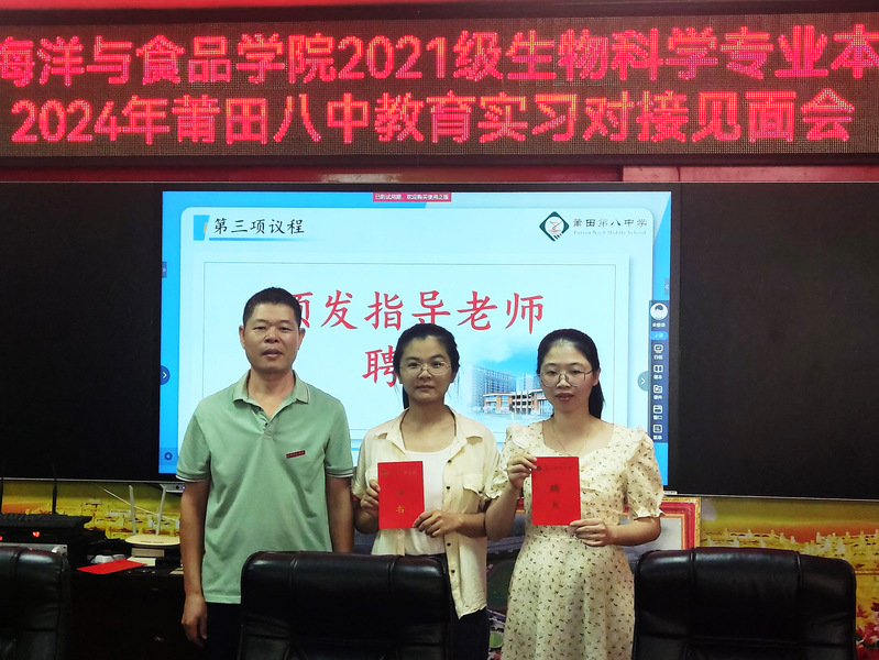 我院领导分别为莆田八中实习指导教师颁发聘书。在仪式举行的全过程中,每一位指导教师及实习生都怀着激动的心情。此刻,他们手中的聘书和协议,不仅仅是一种仪式象征,更是一份责任,一份担当,是泉州师院海洋与食品学院与莆田第八中学情感连接的桥梁,是泉莆教师责任联系的纽带,更近一步地连接了指导教师和实习生们的心。