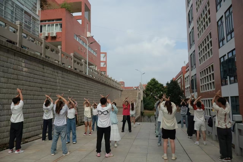 为迎接即将到来的第42届校运动会,排舞成员每天中午、晚上在宝龙楼或理工楼前集合,召开紧张而有序的训练。