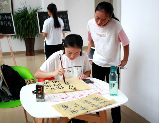 新生在向学姐请教书法技巧
