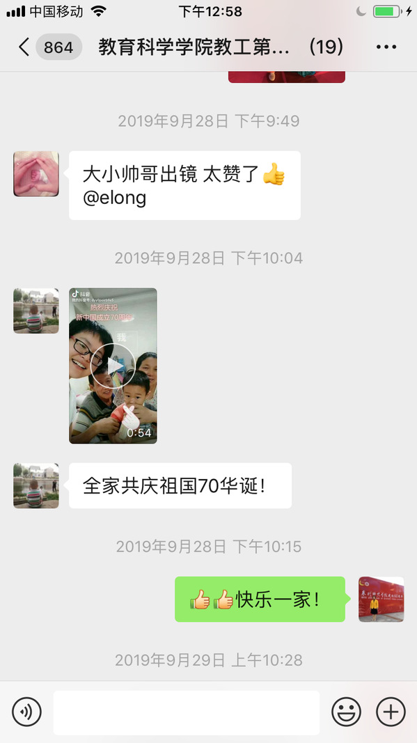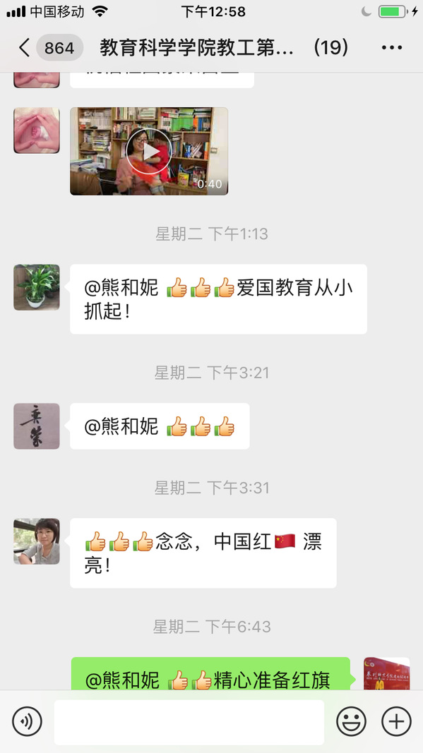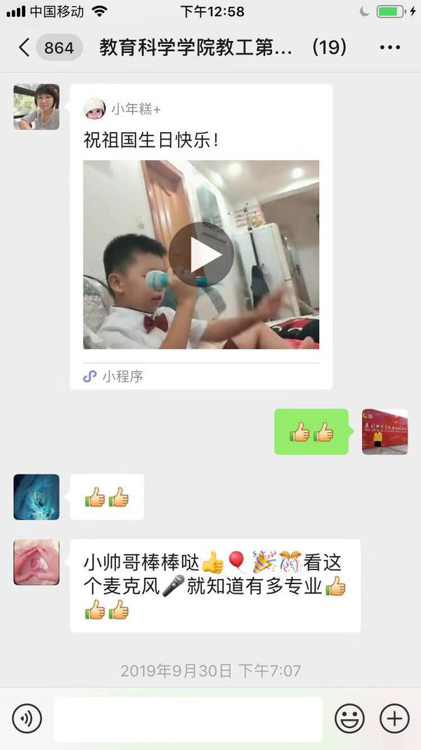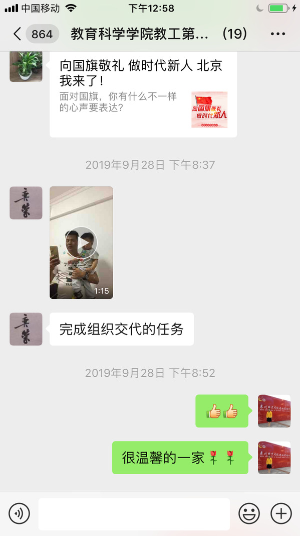 2019年9月28日到10月7日,教育科学学院教工第一团支部召开“用心表达我的心声,共祝祖国70华诞”—“我和我的祖国”主题党日活动。支部党员利用微视频、快闪、抖音、照片、电子音乐相册、书法作品等方式在支部微信群上传“我和我的祖国”爱国资料。支部党员苏明强校长、黄晓冬校长在服务k8凯发(中国)天生赢家·一触即发第二附属小学的工作中,发动该校所有师生拍摄了以“我和我的祖国”为主题的音乐视频,用行动践行了爱国情怀;支部书记许松芽老师利用业余时间参与《我和我的祖国》的声乐练习,并参加由丰泽区东海街道党工委、办事处等联合主办的“庆祝中华人民共和国创建七十周年联欢晚会暨翡翠老年学校教学成果汇报演出”;支部纪检委员党员黄妍妮(在读博士)、宣传委员朱媛媛(在读博士)、陈奕荣博士、熊和妮博士携同家人共同演唱《我和我的祖国》;支部组织委员王艳芳老师书写书法作品参与泉州文学艺术联合会、泉州企业与企业家联合会等单位主办的“庆祝中华人民共和国创建70周年大型书画展”;党员黄青青老师用心制作了音乐相册。