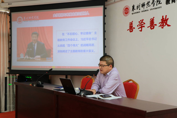 根据学院党委“不忘初心、牢记使命”主题教育工作安排,11月14日,教育科学学院党委书记陈一祥在特教大楼A601会议室上了题为“牢记立德树人初心,完善五项保障机制,提升学院‘三全育人’服务水平”的专题党课,教科院党委委员、团支部书记、团支部委员、师生代表共70余人聆听党课。