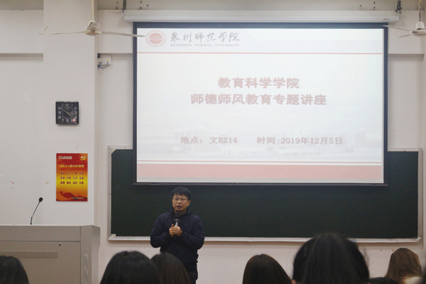 12月5日下午,教育科学学院学前教育专业于文科楼召开以“依法执教,成就教师梦想”为主题的师德师风教育专题讲座,专业副主任邓岳敏担任主讲人。