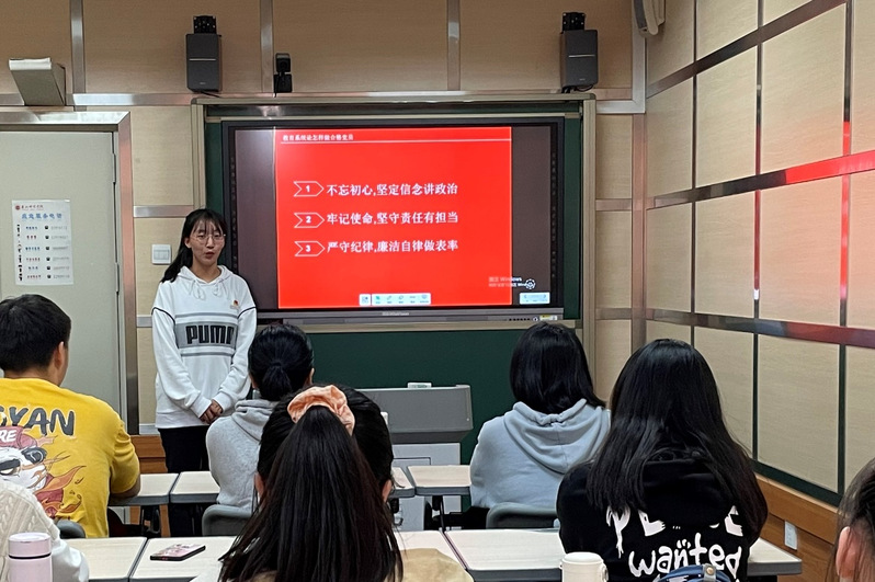 杨静以“牢记教育初心 做新时代教科人”为题,结合我院专业特色,告诉了我们应当立初心、守初心、践初心、担使命,担负起为党和人民培养社会主义建设者和接班人的使命。