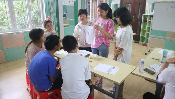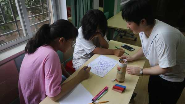 第一个环节是 “警察抓小偷”。学员2人一组,一个扮演警察,一个扮演小偷,在纸上勾画,你追我赶,然后在每张纸里寻找图案。顺利获得自由的线条勾勒,学员体验到简笔绘画的乐趣,促进了合作分享的能力。第二个环节是“我画我自信”。三位泉州师院2019级应用心理学专业大学生分别带领3个小组的学员,以花木兰替父从军回家的场景为片段,引导学员研讨花木兰家人关系,然后创作出《花木兰》情景剧简笔画。第三个环节是“你猜我说”。各组成员分享绘画成果,其他小组成员根据“这个作品反映了花木兰和家人之间的什么关系?”的问题进行猜测研讨。指导老师引导学员叙述绘画作品背后的家人故事,梳理家人冲突的脉络。第四个环节是“父亲节的礼物”。大学生和学员在各自挑选的彩色卡纸上写下最想跟父亲说的一句话。学员写下四期活动收获和建议。活动结束后,泉州师院教科院教工第一团支部指导老师许松芽副教授、石狮近邻许志上主任与大学生志愿者召开活动总结研讨。