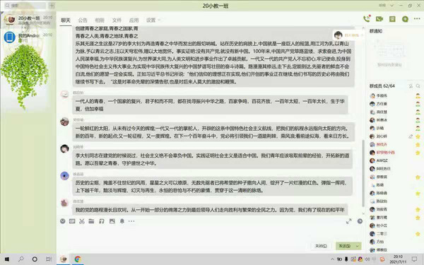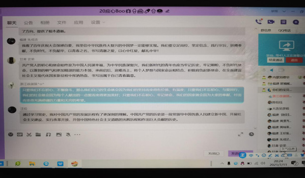 此次党史学习线上团日活动,最后在学生们持续踊跃的心得分享中步入尾声。本次团日活动,为我们新时代中国青年给予了更为直接、更为有效的机会,让我们学会感恩生于和平年代,感激成长于百年历史机遇碰撞之际,激励自己迎合新时代新格局更需加倍付出奋斗朝气。顺利获得学习贯彻习近平总书记在庆祝中国共产党创建100周年大会上和“七一章”颁投仪式上的重要讲话精神,紧跟上“学党史,强信念,跟党走”学习教育,青年一代思想意识形态必将得到进一步夯实与升华,为新时代新格局中华民族伟大复兴的中国梦实现挥舞思想旗帜。