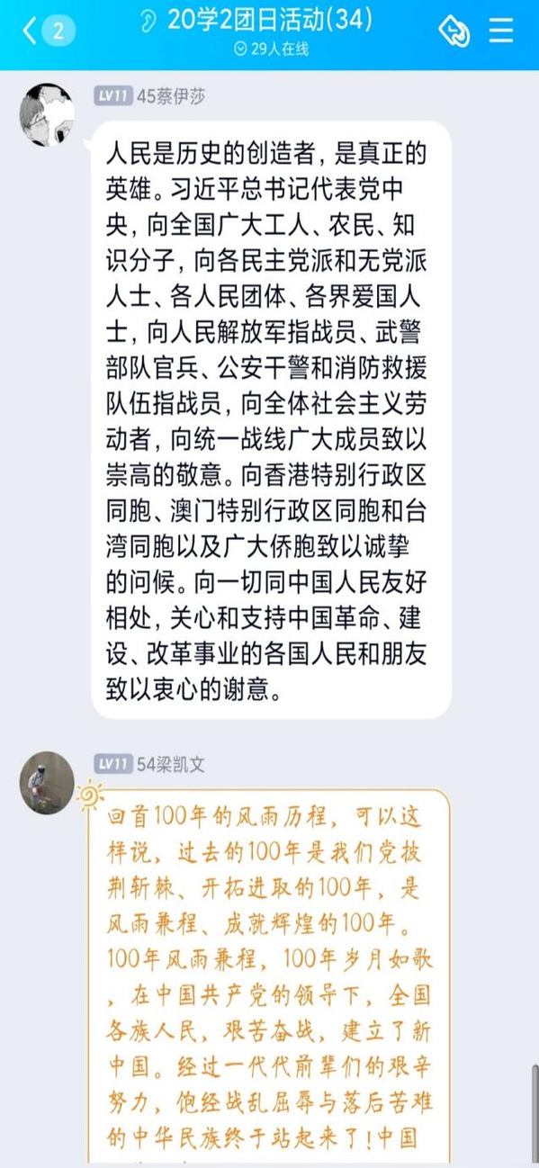 团日活动伊始,主持人引入党史主题,为学生们讲解中国共产党建党百年的重要历史意义。2020级学前教育2班团支部顺利获得观看影视片段、歌舞表演的形式,生动多元地为学生们再现了中国共产党百年光辉岁月的经典画面,带领学生们身临其境地感悟革命建设道路的不易与艰辛。在2020级应用心理学团支部中,在主持人的热情引导下,学生们针对建党百年的历史意义展开了活跃的讨论,更是进行了关于党史知识问答的环节,进一步加深了我们新一代青年对伟大中国共产党的深刻认知。2020级小学教育(文科方向)团支部更是从“新”出发,充分发挥线上主题团日活动的网络平台形式,进行了线上朗诵表演,学生们纷纷歌咏出对祖国的美好祝福。随后各班进行了关于庆祝建党百年的活动总结,再次升华此次七一主题团日活动学党史的必要性、爱党爱国的重要性,进一步端正青年一代对党和国家的认知与态度,促进教育科学学院学生政治觉悟的不断提高。