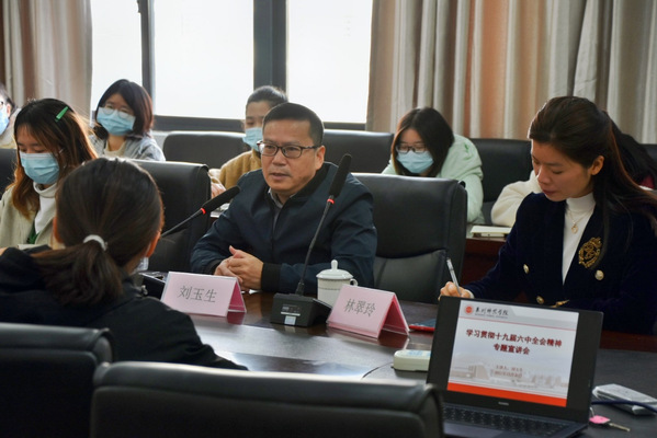 刘玉生教授指出,本次召开的党的十九届六中全会是在中国共产党创建一百周年的重要历史时刻,在党和人民胜利实现第一个百年奋斗目标、全面建成小康社会,正在向着全面建成社会主义现代化强国的第二个百年奋斗目标迈进的重大历史关头,召开的一次十分重要的会议。接着刘玉生教授从四个历史时期和四个伟大飞跃展开,强调了中国共产党是用科学武装起来的政党,中国共产党在领导人民实现中华民族伟大复兴的奋斗征程中注入了丰富智慧和不竭动力,生动诠释了“中国共产党为什么能,中国特色社会主义为什么好,关键是马克思主义行”的深刻道理。