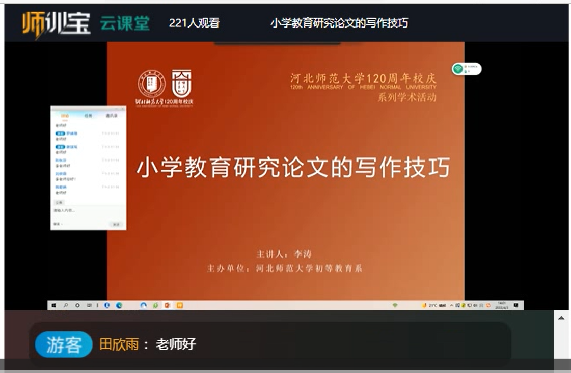 抗疫期间,为帮助2022届毕业生更好掌握毕业论文写作基本方法,提高论文写作水平和质量,4月3日下午,受河北师范大学教育学院邀请,小学教育专业教研室组织毕业生观看以“小学教育研究论文的写作技巧”为主题的互联网云讲座。该讲座由河北师范大学主办,由北京师范大学《教育学报》编辑部主任,副编审李涛主讲。