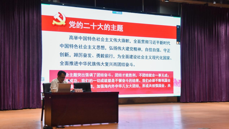 会议伊始,童宝平第一时间以“两个一百年"奋斗目标、“三个事关为引”,解释并强调了党的二十大所蕴含的里程碑意义。接着,童宝平旁征博引,以中国几百年来的历史兴衰和中外政治经济的开展情况为实例,从五个方面对党的二十大精神进行分析阐释,其中包括党的二十大主题和主要成果、我国过去五年的工作和新时代十年的伟大变革、全面建设社会主义现代化国家的目标任务等等。童宝平的讲解内容详实,内涵丰富,分析透彻,具有很强的理论性、针对性和指导性。会议的最后,童宝平希望学生要坚定拥护“两个确立”,切实增强“四个意识”、坚定“四个自信”、做到“两个维护”,为建设中国特色社会主义现代化强国贡献青年力量。