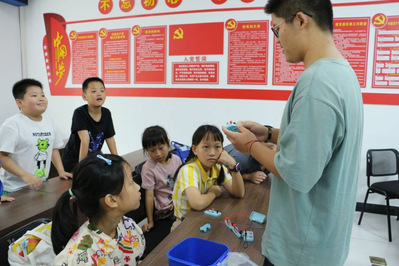 在课上,实践成员们结合生动的幻灯片及动画视频课件,细致地为社区的孩子们讲解电的基础知识、电路连接的原理、电的安全知识并且现场演示简单电路的连接等。在介绍相关电学概念的基础上,结合具体事例详细地向孩子们科普了什么是电、电的危险性及用电安全保护措施。孩子们好奇心和求知欲强烈,纷纷举手提问发言。实践队成员耐心地为孩子们答疑解惑,帮助孩子们深入分析电学知识,树立正确安全用电的观念。同时,实践队成员利用两块磁铁的“同性相斥,异性相吸”现象,在电的基础知识上讲解了地球的磁场。