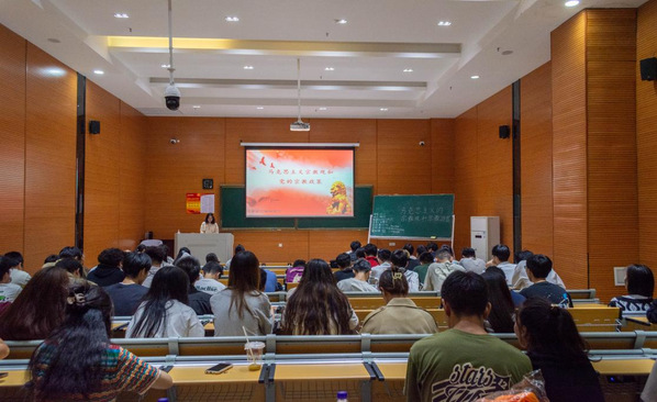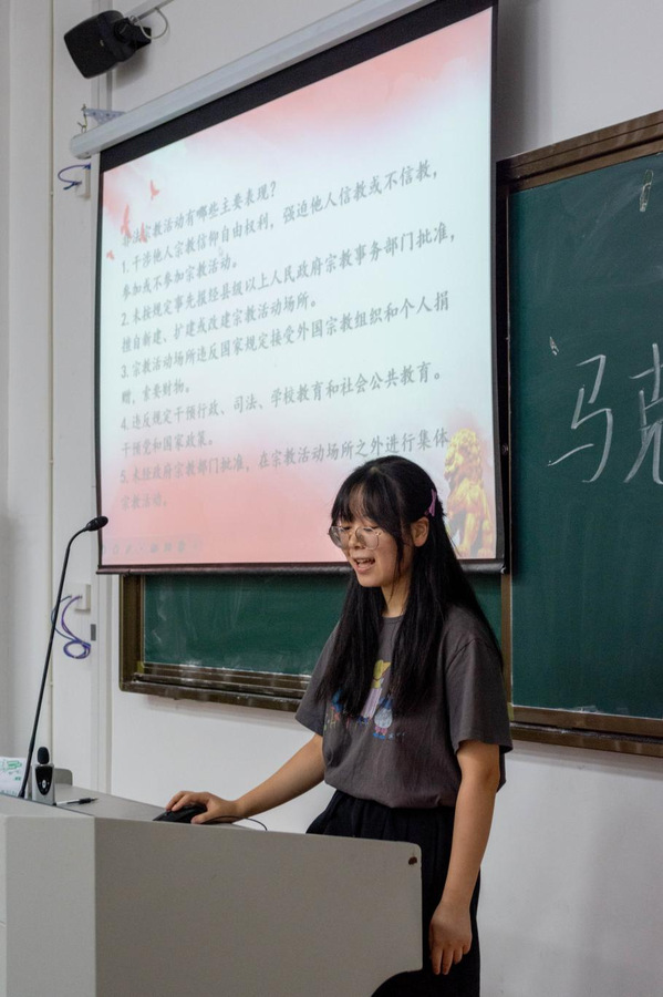 中共党史读书社成员从两个方面展开介绍。第一部分是“什么是宗教”,提到宗教起源于人类的物质和社会条件,并与社会开展密切相关,强调了宗教与社会、经济、政治和文化等各个层面相互作用的关系;第二部分是“我国宗教概况和宗教政策”,强调了在中国,我们始终高度重视宗教事务,并以马克思主义宗教观为指导,制定并贯彻党的宗教政策,我们鼓励宗教界持续参与社会建设、促进和谐开展,并致力于有助于宗教与社会主义社会相适应。同时,宣讲人还提到了非法宗教活动以及宗教和邪教在本质上的不同,提醒同学们须加强对宗教极端主义思想的辨别和批判。