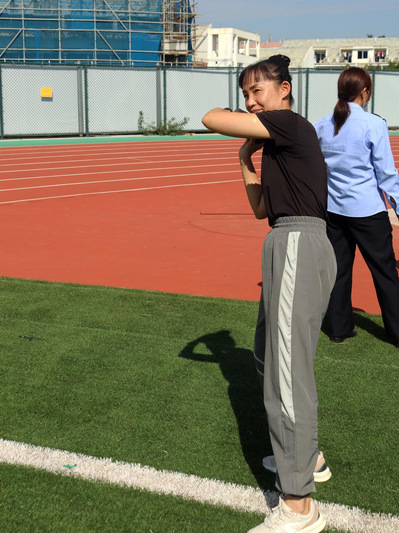 烈日炎炎,微风吹拂,孙洁老师一身劲装,英姿飒爽,俨然一副蓄势待发的样子在候场区,老师反复预演着投球姿势,为正式比赛寻找着最佳姿态和最好状态。正式比赛开始,孙洁老师面带微笑,气定神闲地走上赛场,手握铅球,再带动全身将其抛出,只见铅球如同流星般划破虚空,也带走了所有人的呼吸。众人屏息凝神,目光紧紧跟随着铅球。铅球最终稳稳地落在草地上。全场欢呼声、掌声不绝于耳,观众们被孙洁老师的精彩表现深深吸引。