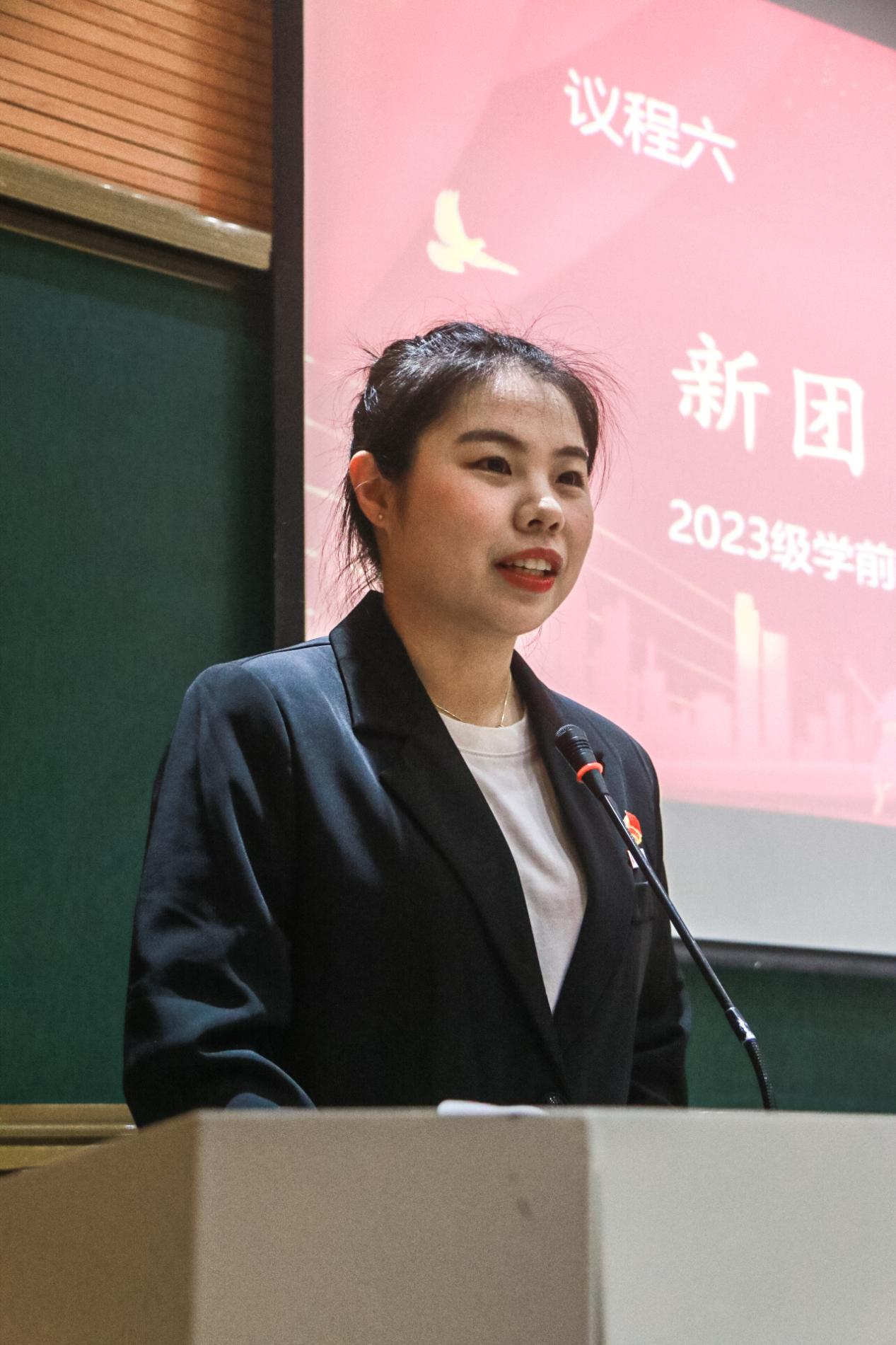 院团委会书记处团委助理王馨然代表院团委向新团员们介绍了《中国共产主义青年团章程》中有关团员的义务和权利的条款。老团员代表院团委会书记处团委助理吴雅桢分享了入团后的进步以及对团的深刻认识,号召新老共青团员要有朝气、有力量、有恒心、有行动,遵纪守法、刻苦学习,用实际行动来证明自己无愧于“共青团员”这个光荣的称号。新团员代表2023级学前教育(专升本)3班的林楚琪同学向新团员们发出三点倡议,一要坚定理想信念,做有志青年;二要严于律己,做有德青年;三要敢为人先,做有为青年。并表示,会牢记祖国和组织对新青年们的殷切希望与嘱托,将在后续学习生活中践行入团誓词,牢记初心使命,在建设祖国的新征程上贡献自己的青春力量。