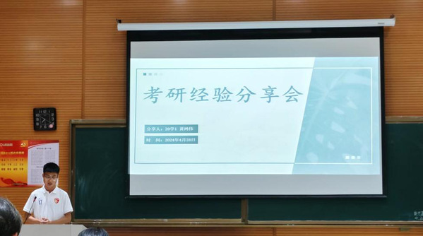 会上,郑艺琰、张舣、陈艺谋和黄鸿伟四位同学分别结合自身考研的经历,围绕“如何确立考研目标”、“如何科学择校”、“如何面对时间冲突”、“如何科学备考”四个方面进行讲述,为学弟学妹们分享了他们的考研经验。其中,就“如何科学备考”,四位同学重点讲述了自我把控以及调整心态和作息的重要性,主张在座学生尽可能早一点实行考研准备,科学合理地安排复习的时间,平衡好学习与生活,调整心态,建立知识框架,做到知识内化,坚持到底。在互动环节,四位同学与参会同学持续互动,并对同学们提出的问题一一作出解答。