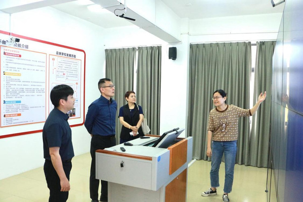 会前,在雷培梁等人陪同下,佘贵添一行参观考察了教育科学学院学前教育专业办学成果展和特殊教育实验实训中心。