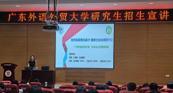 5月7日下午,应用心理学专业于特教大楼第二学术报告厅召开广东外语外贸大学社会与公共管理学院研究生招生宣讲会,该院专硕负责老师毕爽围绕历史沿革、师资队伍、专业建设以及学生就业等方面,全面介绍了广东外语外贸大学社会与公共管理学院人才培养机制的优势与特色。她指出,广东外语外贸大学社会与公共管理学院高度重视在教育科学学院的研究生选拔工作,并介绍了近年录取情况以及考研参考书目等经验,鼓励有志学子持续报考。随后,教育科学学院2019级应用心理学本科生张亚静,今年研究生拟录取至广东外语外贸大学社会与公共管理学院心理学专业,以思维导图形式,详细介绍了时间安排、模拟考试、面试准备等内容,并欢迎学弟学妹报考广外。