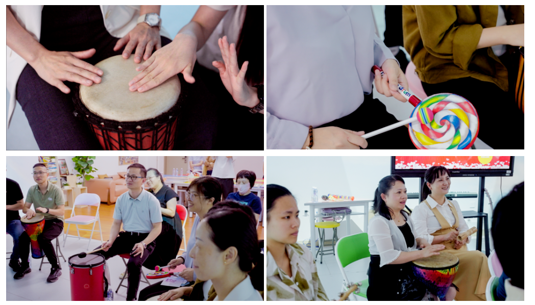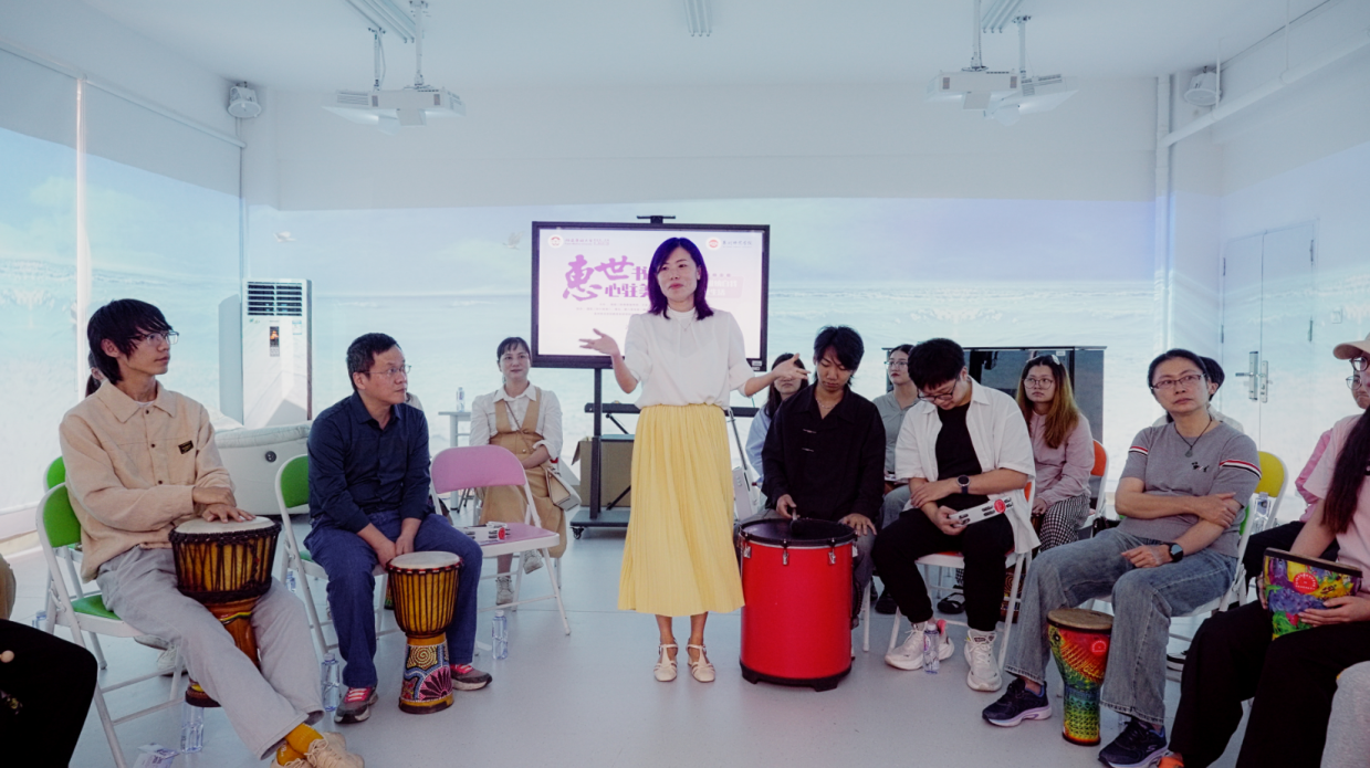 教育科学学院艺术教育中心副主任陈佳老师带领研究生召开了音乐治疗活动。活动过程中第一时间进行“音乐肌肉渐进式放松”,引导大家跟随音乐的节奏和旋律进行深呼吸练习,伴随着音乐的起伏和治疗师的指引在不知不觉中达到深度放松的状态。第二个环节是“音乐鼓圈”,治疗师第一时间示范如何跟随音乐的节奏敲击鼓面,然后邀请大家逐渐加入。在鼓声的激荡中,参与者能够释放出内心深处的情感,并能够达到一种集体的共鸣,体验合作的力量,感受和谐的美妙。