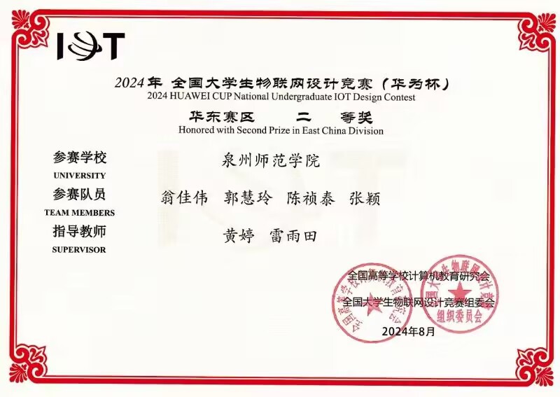 2024年8月,由全国高等学校计算机教育研究会主办的全国大学生物联网设计竞赛(华为杯)华东赛区于2024年08月13日至08月14日在南京大学仙林校区举行。经过激烈的角逐,教育科学学院数字媒体专业2022级翁佳伟、郭慧玲、2023级陈祯泰、特殊教育专业2021级张颖等荣获二等奖。指导老师为黄婷,雷雨田。