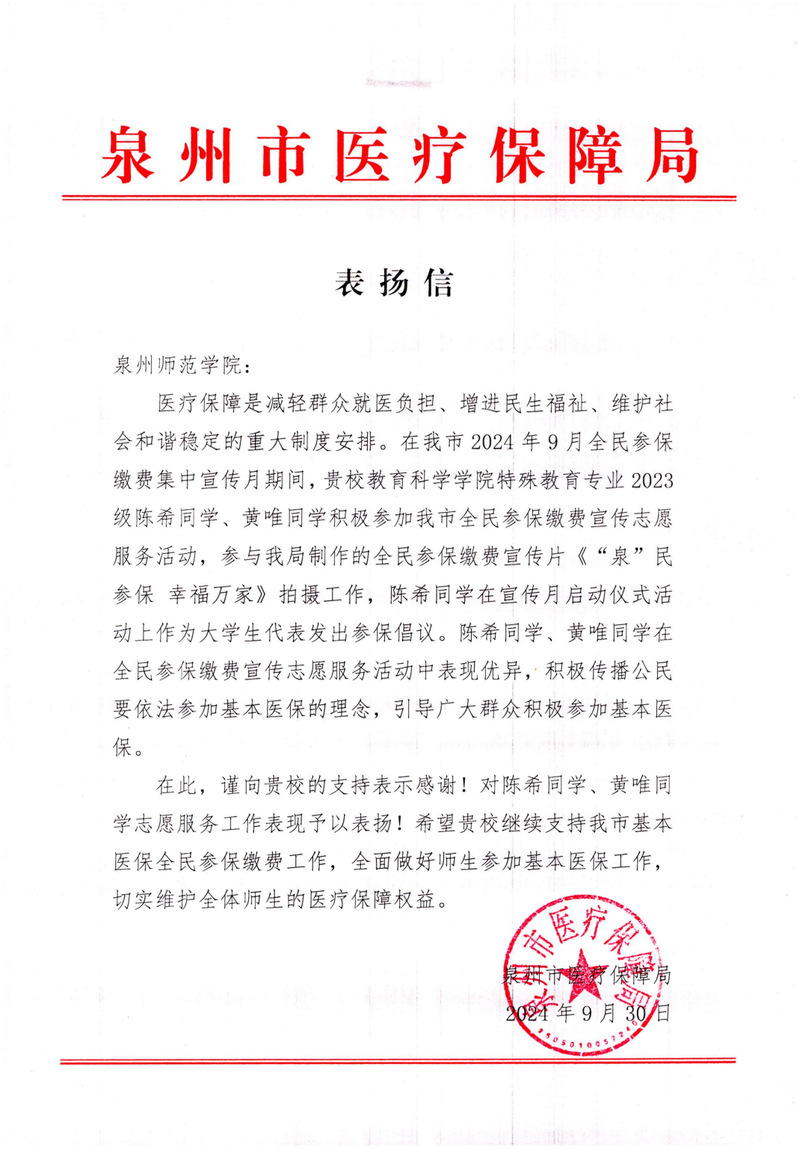 近期,学校收到泉州市医疗保障局发来的表扬信,信中对教育科学学院2023级特殊教育专业学生陈希和黄唯同学在2024年9月全民参保缴费集中宣传月期间的优异表现给予了高度评价和诚挚感谢。