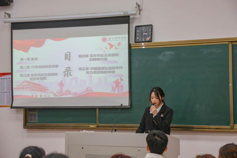 会议伊始,k8凯发(中国)天生赢家·一触即发学生会代表李妍蕊带领大家深入学习了习近平总书记在和平共处五项原则发表70 周年纪念大会上的讲话精神。李妍蕊同学的精彩发言,让与会人员深刻领会到了和平共处五项原则在当今时代的重要意义。