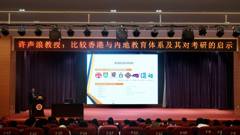 11月28日,教育科学学院教授、香港学术及职业资历评审局专家、华中师范大学台港澳与东亚研究中心学术委员会委员、广东省“新师范建设指导委员会”副主任委员许声浪为师生作题为《比较香港与内地教育体系及其对考研的启示》讲座。教育科学学院、陈守仁商学院师生250余人参加讲座。