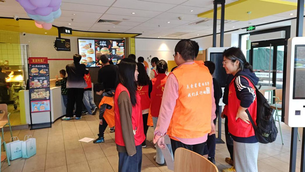 随后,支部同学组织孤独症儿童前往附近的麦当劳餐厅。在餐厅里,学生们有序排队、仔细研究菜单,自信地向工作人员表达点餐需求,成功完成点餐。在安全可控的环境中,这种沉浸式的现场实践教学让他们能将课堂所学知识运用到实际,不仅提高了社交能力,还切实体验到点餐的乐趣,增强了自信心。