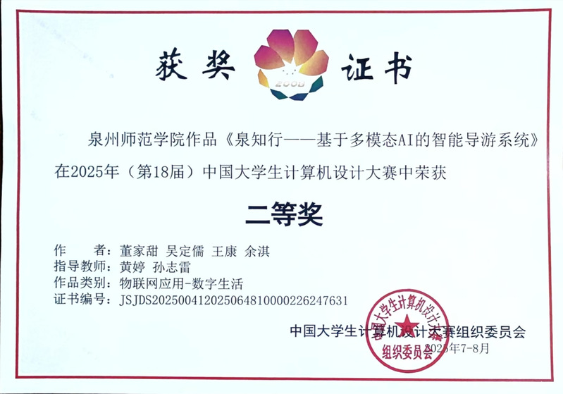 此次获奖是学院深化“新工科+新文科”融合建设的又一成果。未来,学院将持续优化《泉知行》系统,拓展其在非遗保护、智慧教育等领域的应用,并依托赛事平台有助于更多学子参与创新实践,为数字中国建设贡献青春力量。