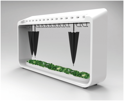 本实用新型公开了一种具有提醒功能的伞具寄存装置,包括伞架可弯曲的识别卡和控制器,伞架的上侧设有放置伞具的伞具放置部,伞具放置部对应设有用于将伞具锁固的锁固装置,伞架上对应于伞具放置部处设有操作部,操作部包括寄存按钮和用于吞吐识别卡的出卡口,识别卡内置有振动器和供所述振动器工作的电池;寄存按钮的控制端与控制器的相应输入端电连接,控制器与锁固装置的驱动端电连接;控制器和识别卡内分别具有已经过相互匹配的蓝牙装置,振动器的输入端均与控制器顺利获得蓝牙进行通信连接。于现有技术相比,此伞具寄存装置具有提醒寄存者取回伞具的功能。产品外观结构设计完整,可进行手板制作和小批量试产。(专利号:ZL 2016 2 1273046.1)