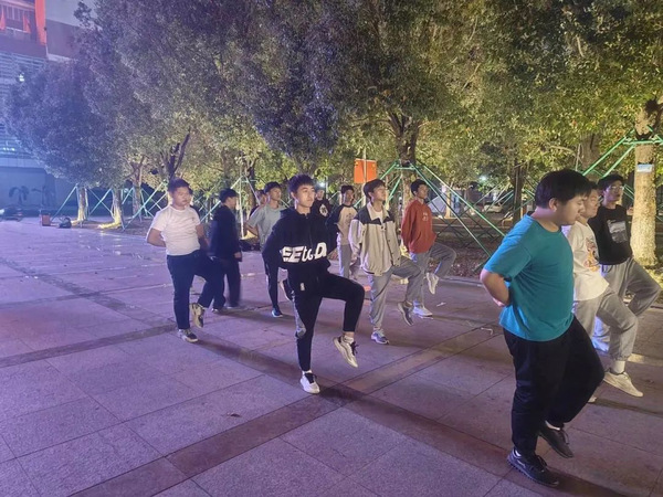 天也将晓,人也愈锐。东方泛起鱼肚白,同学们却越练越振奋。“日月纷纷车走坂,少年意气何由挽。”也如《沁园春·长沙》中“恰同学少年,风华正茂;书生意气,挥斥方遒。”训练虽然辛苦,但同学们的热情突破了难关,对匍匐拳训练仍是微笑面对。